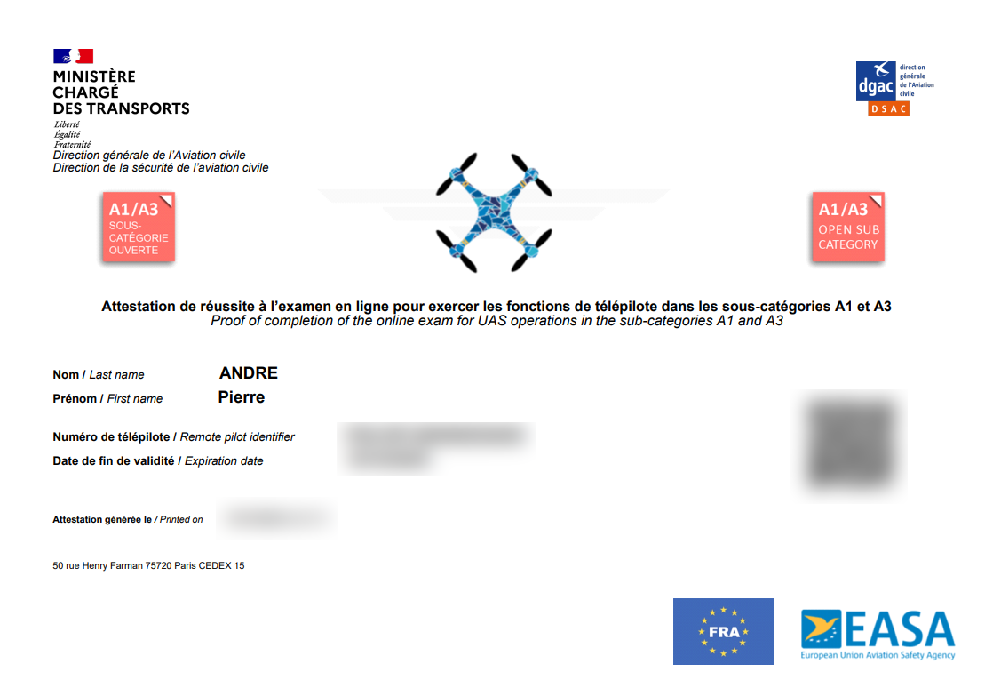 Cet espace vous permettra de suivre la formation et de vous préparer à passer l’examen en ligne nécessaires pour exploiter dans les sous-catégories A1 et A3.